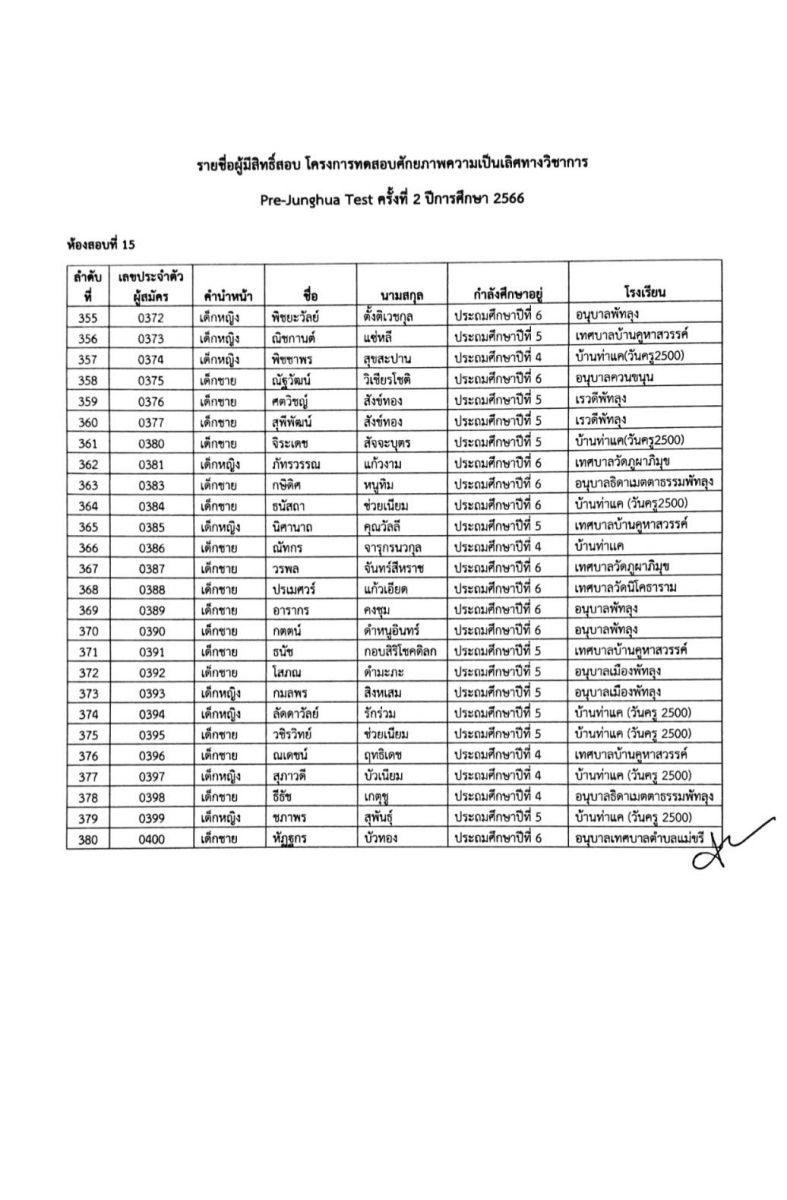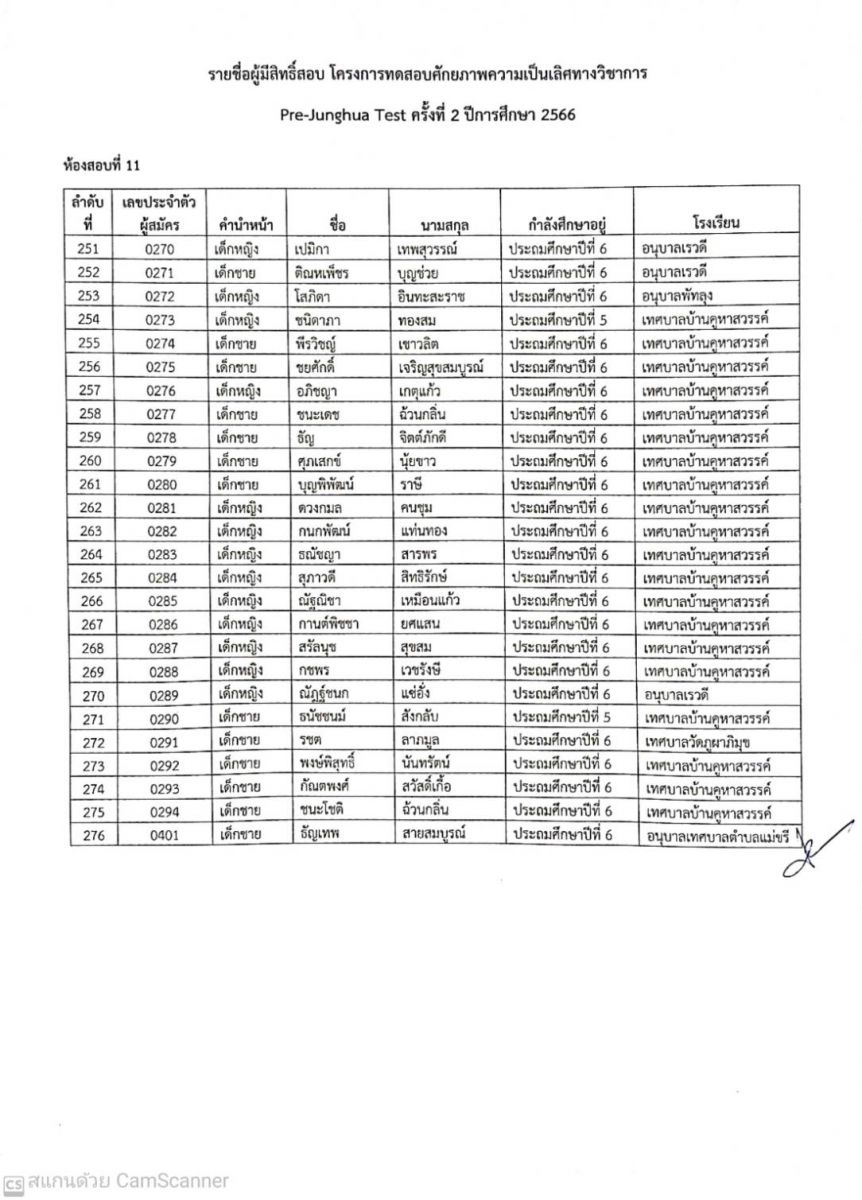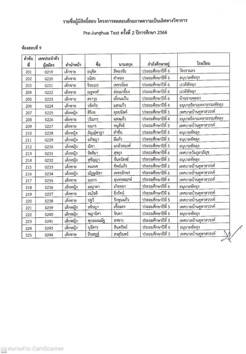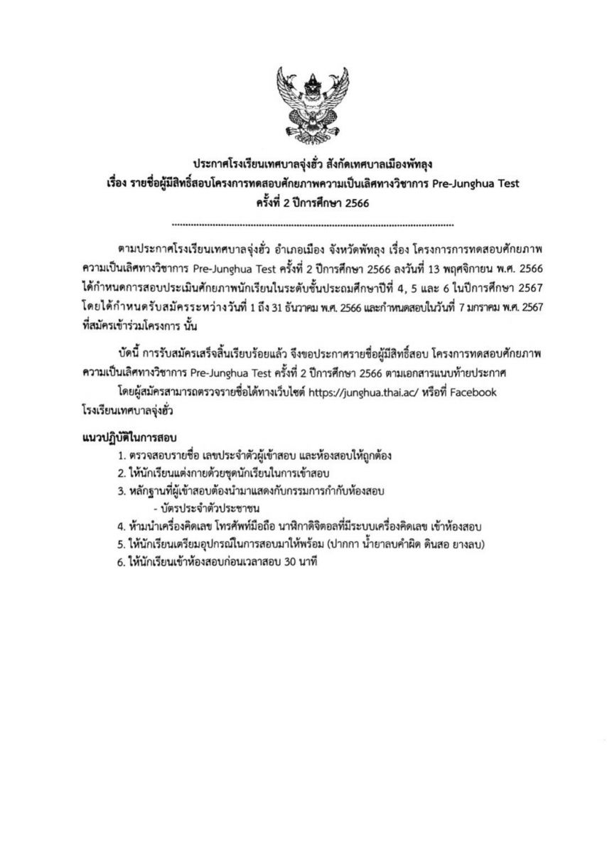 ประกาศรายชื่อผู้มีสิทธิ์สอบ Pre-Junghua Test