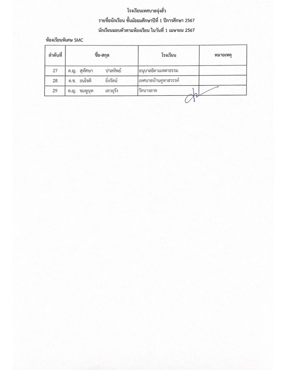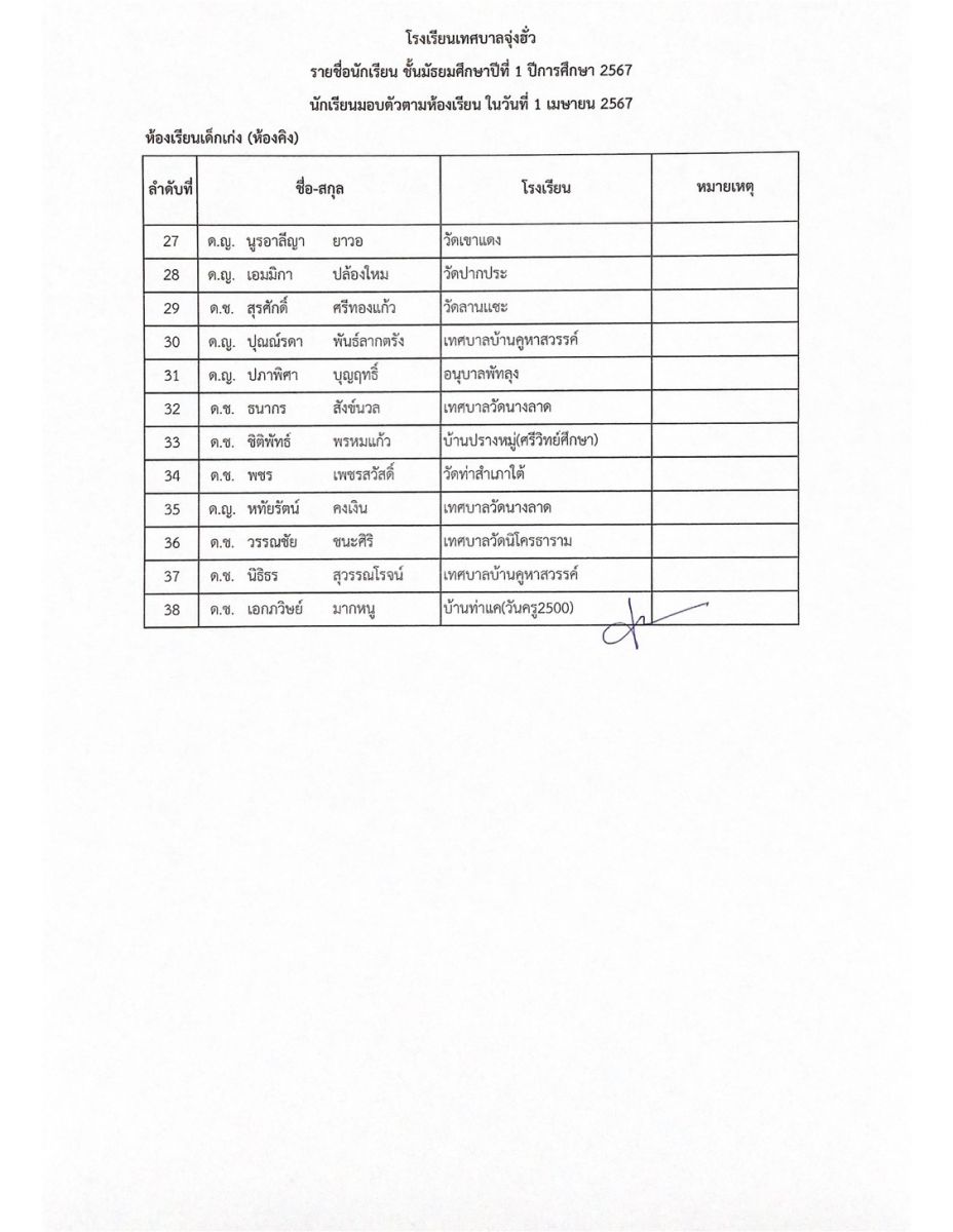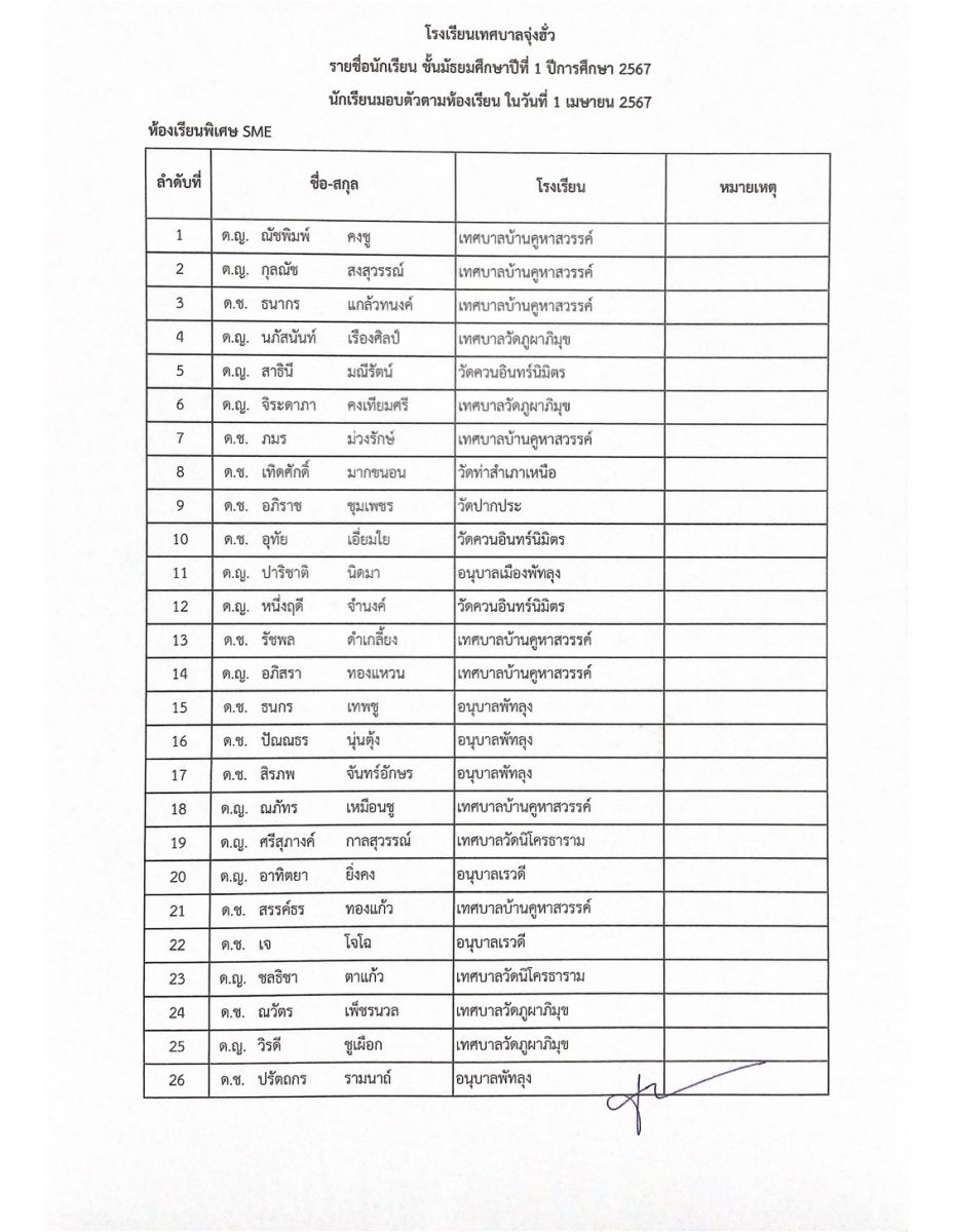 ประกาศโรงเรียนเทศบาลจุ่งฮั่ว เรื่อง ประกาศรายชื่อมอบตัวชั้นมัธยมศึกษาปีที่ 1 ปีการศึกษา 2567
