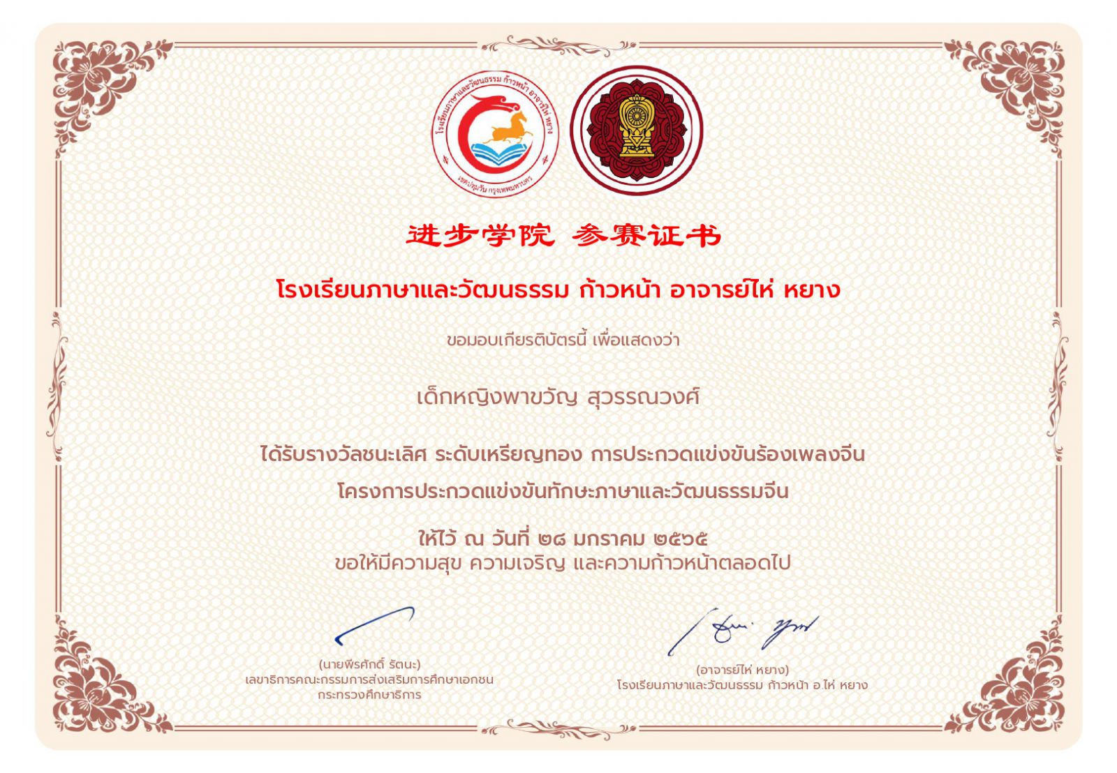เด็กหญิงพาขวัญ สุวรรณวงศ์   ได้รับรางวัลระดับเหรียญทอง  การประกวดแข่งขันร้องเพลงจีน